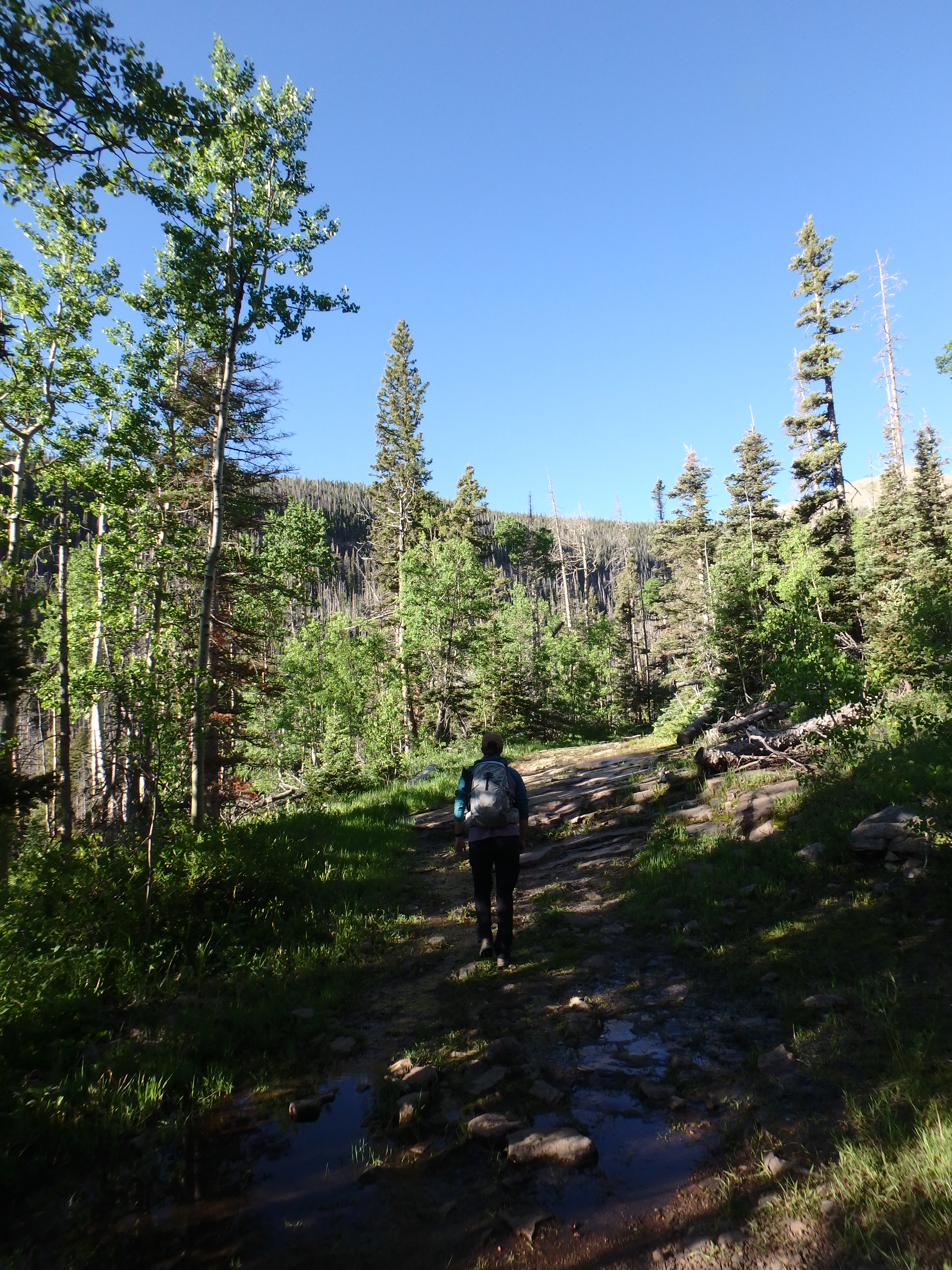 Like Humboldt Peak, this hike began with us driving up a winding rocky road for several miles along a mountainside. Doing this shaved 6 miles off of the hike, but it may have shaved 6 days off my uncle’s life as well. He was not a fan of the speed and jostling at which my cousin launched us up the mountain in her truck. The dog didn’t seem to mind, though. She was fast asleep with her head in my lap during the commotion.