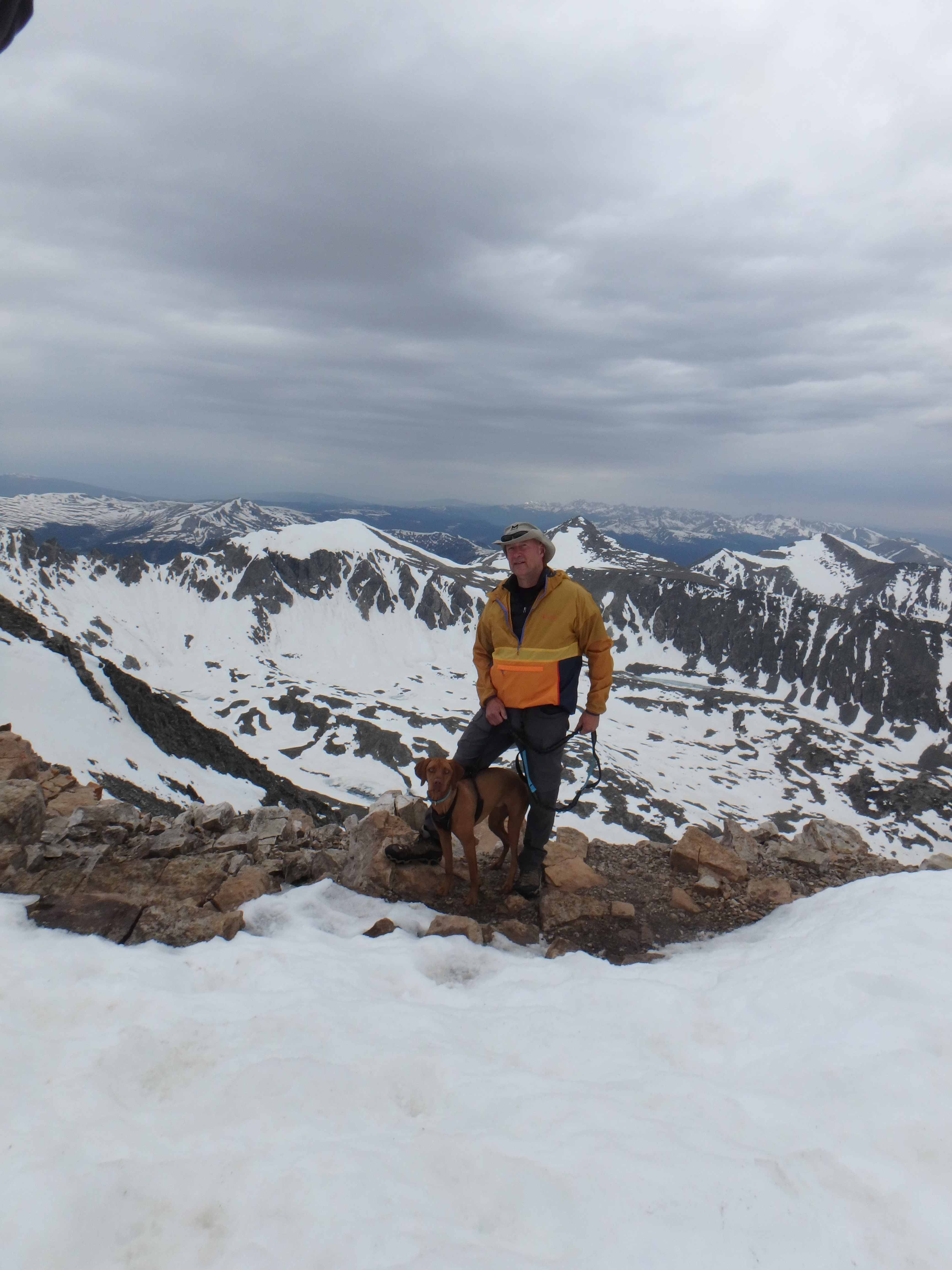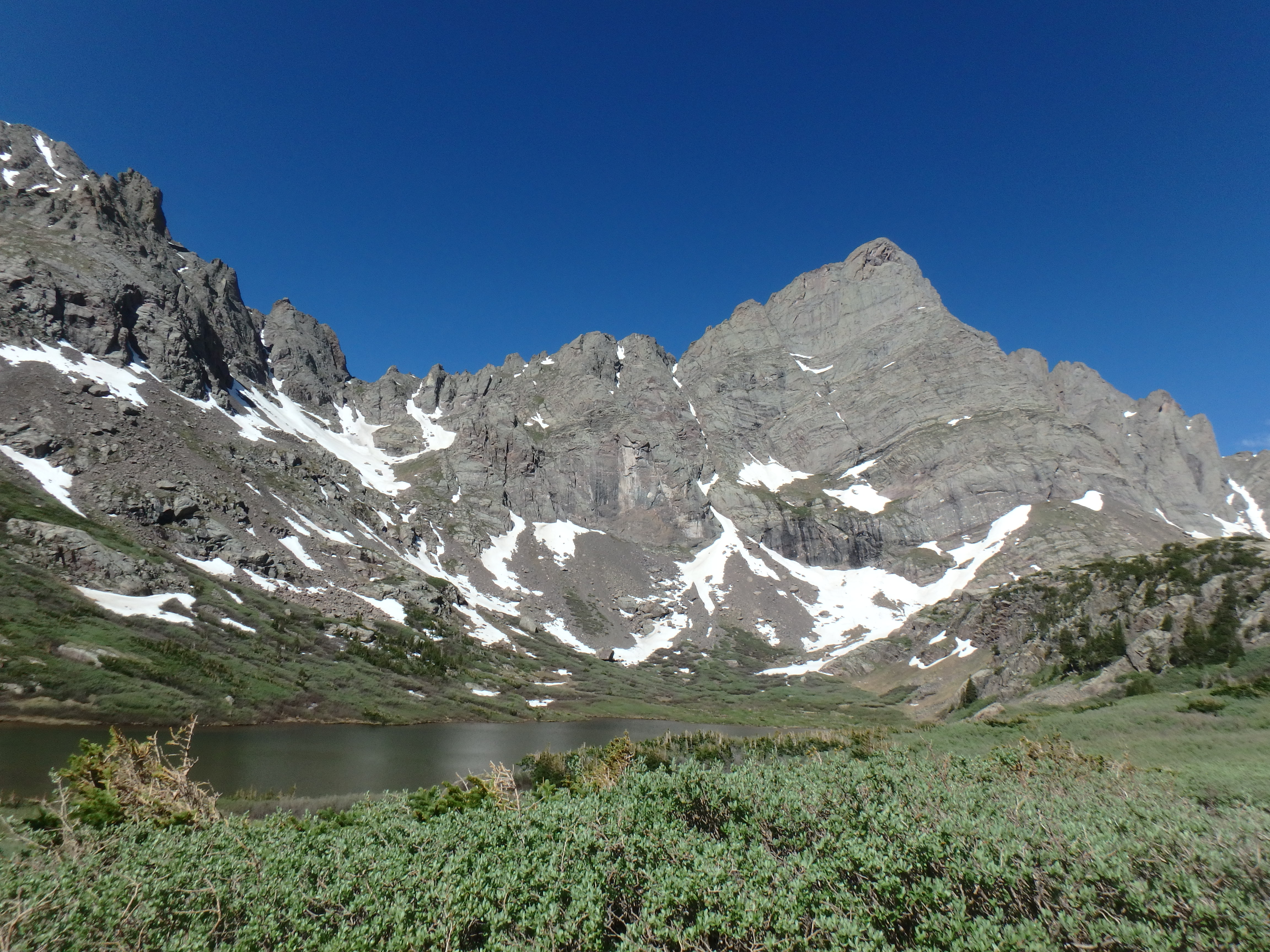 After what felt like forever on that bumpy road, we got to the trailhead. After eating some last minute snacks, my uncle hooked the dog into her leash, and we set off. The beginning of the hike saw us steadily climbing a slightly narrower rocky road for a few miles. Eventually it turned onto a proper hiking trail which snaked its way through trees, meadows, and past a lake. Once we got to the lake, we decided to break for snacks as to fuel up for the push to the summit. The view was incredible. At the trailhead, we had looked at a map of the surrounding peaks so that we could put names to the mountains. My cousin was already familiar with the two most intimidating of these surrounding peaks, Crestone Peak and Crestone Needle. These are 14ers as well, but at my experience level it will remain out of reach for some time, maybe forever.