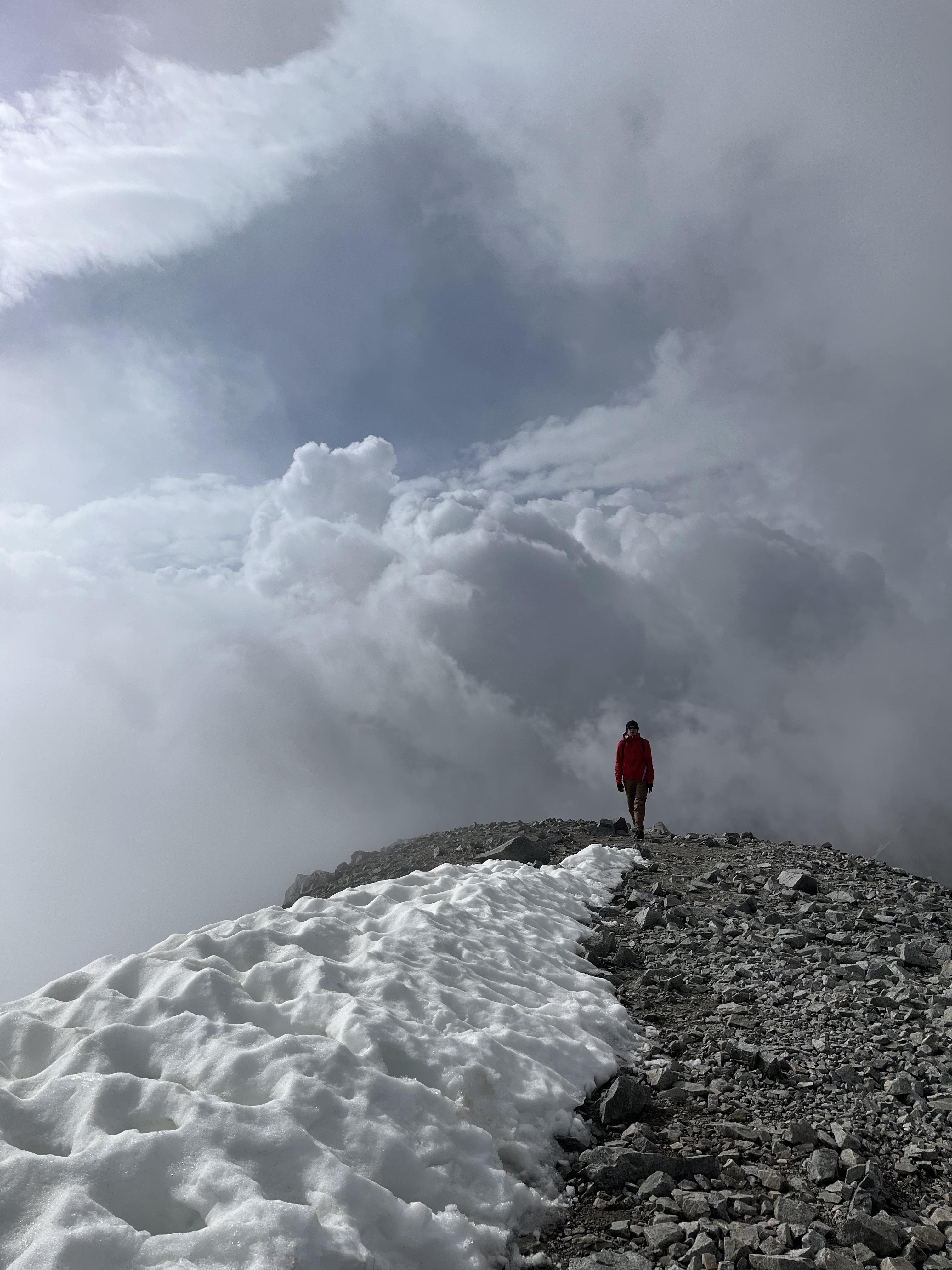 A few minutes later, my parents summited. My dad threw his pack on the ground and sighed heavily while we chuckled. Out of his pack he pulled out a beer for each for us to drink. Everyone partook, except for my mom who was already feeling dizzy. The summit was cold due to the wind and the clouds which hid the sun. We decided to stay on the cold peak for only a little longer. This gave me enough time to listen to the song “Alarm Call,” by Bjork, which I had been unofficially planning to do for months once I was on a mountain top. For those unfamiliar, the lyrics go: “I want to go to a mountain top, with a radio and good batteries, and play a joyous tune, and free the human race from suffering. It doesn’t scare me it all. I’m no fucking buddhist, but this is enlightenment.” Once the song finished we began our descent.
