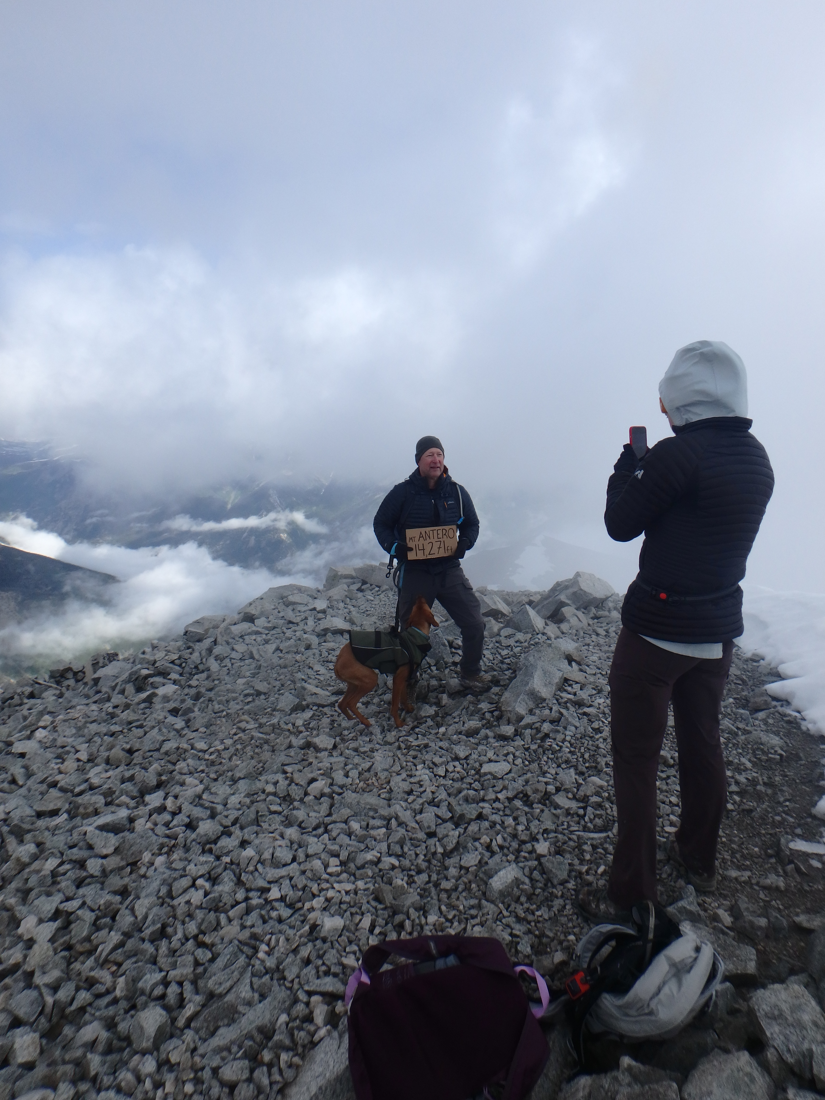 The summit was also the least exciting of the three, as our view was obstructed by the passing clouds. We got our pictures with the cardboard sign and headed back down the rocks. I almost lost the sign to the violent wind coming across the peak.